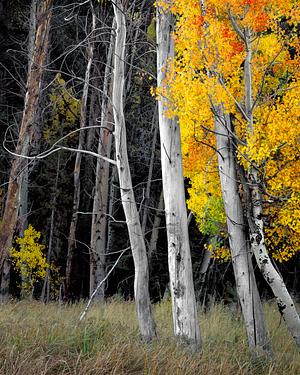 Autumn in the Eastern Sierra is a time when fall colors are abundant. The trees in this aspen grove have a graceful appearance.