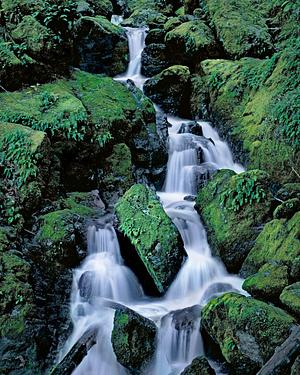 A serene waterfall cascades through a vibrant green mountain landscape in Marin County, California.