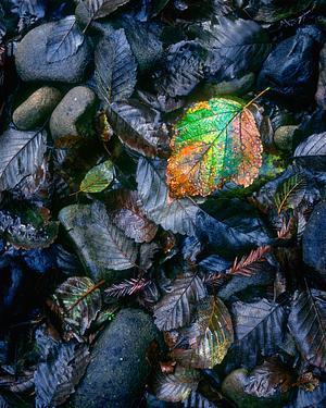 Beauty can be found in the most ordinary subjects, as a single colored leaf stands out against the background. Mendocino County, California.