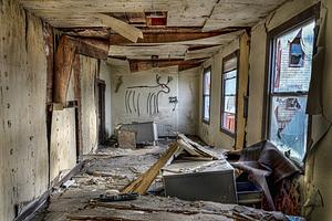 Broken windows cast scattered light on a sinking desk in a battered room. A haunting red bullet hole marks an antlered beast painted on the wall. Mare Island at its creepiest.