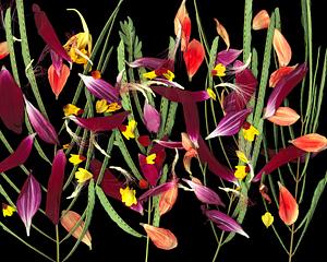 I was working on a scanner piece featuring blossoms in shades of purple, orange, and red when my wife, Patty, came in from a walk with some green twigs she had picked from a tree. It was exactly what the composition needed, and thus "April in Paris" was born.