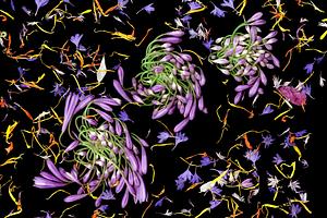 Here's a lively scanogram (yet another term for scanner art) featuring three clusters of tightly coiled purple agapanthus buds with bright green stems, set against a black background. Surrounding the buds are scattered, colorful flower petals and fragments in shades of orange, yellow, purple, and red, creating a dynamic and intricate composition worthy of an honored place on your wall.