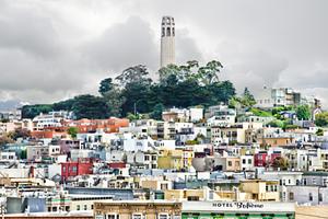 Coit Tower on a typical cloudy day in San Francisco. The architecture is beautiful, with colorful buildings that form the city's famous skyline. The historic North Beach neighborhood offers a unique panorama, making it an excellent spot for sightseeing and urban travel. Processed using the Orton effect.