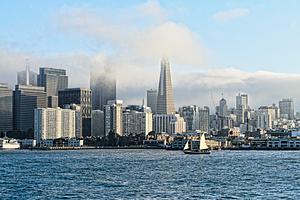 This image depicts the architecture and historic buildings of San Francisco, including the Transamerica Pyramid and Embarcadero, set against a cloudy blue sky while a sailboat cruises by on the deep blue waters of the bay.
