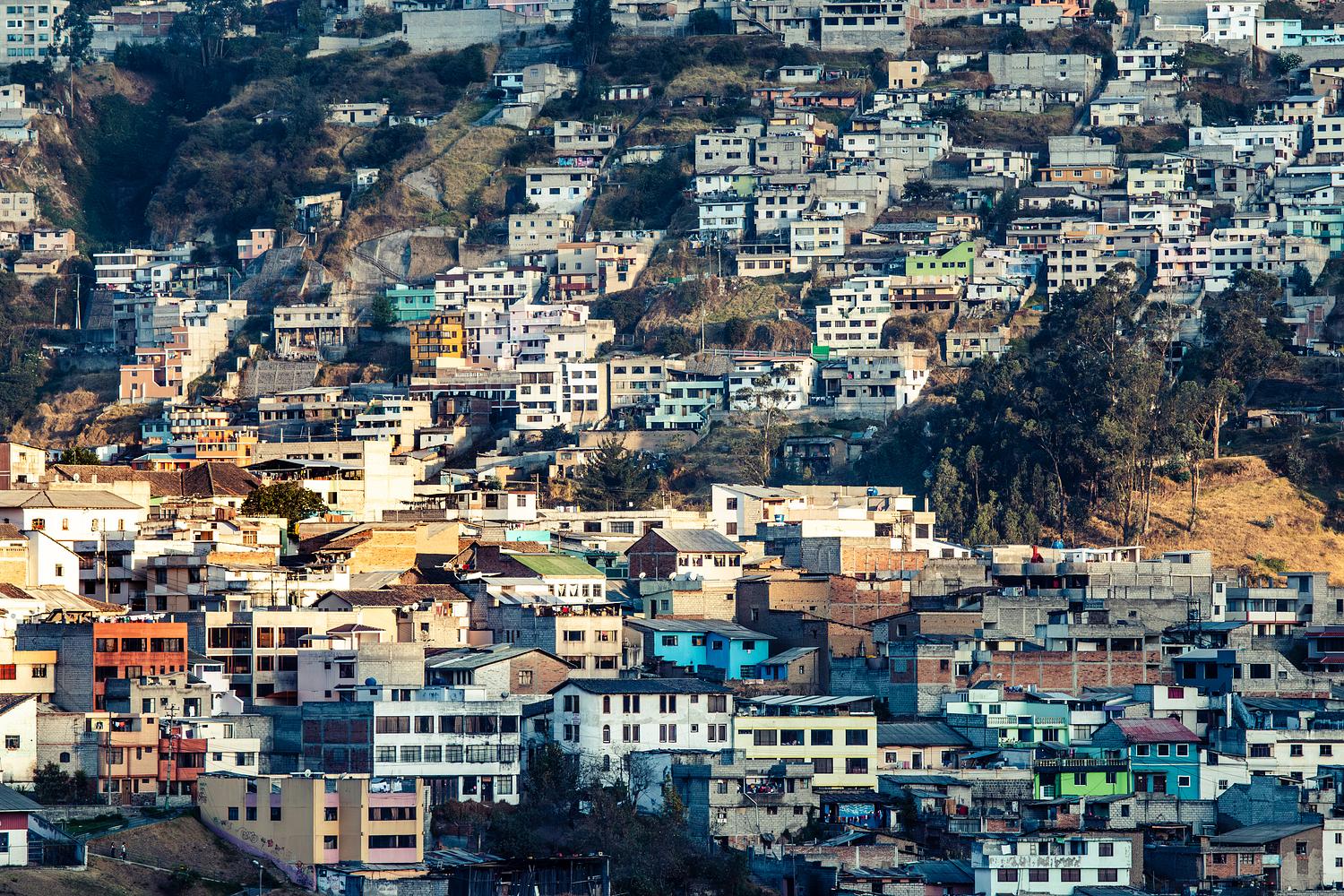 Colorful homes are clustered together on a hillside in a suburb of Quito, Ecuador, situated high in the Andean foothills at an altitude of 2,850 meters (9,350 feet).
