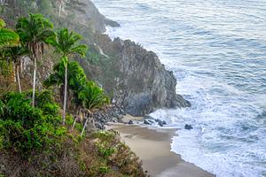 A rugged coastline with jagged cliffs and crashing ocean waves, sunlight highlighting the rocky shore against the deep blue sea.