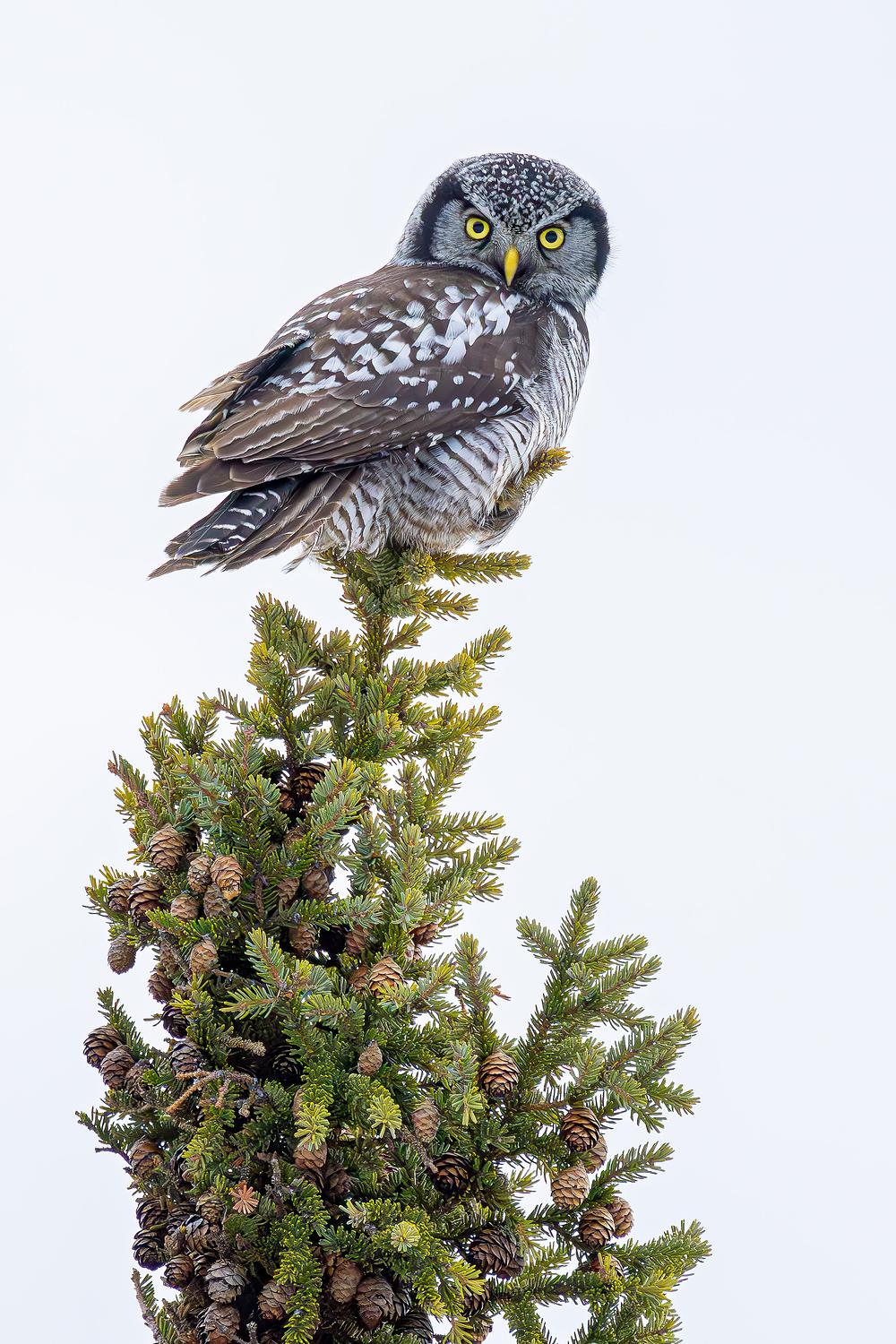 Northern Hawk Owls inhabit the northern boreal forests. This little owl, spotted in Saskatchewan, seemed curious and unfazed by our presence. Measuring about 14 inches in length, including the tail, they resemble owls but behave like hawks, which is how they got their name. Despite this, they are entirely owls and can locate prey by sound, even when it is buried under a foot of snow.