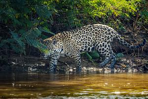 Here's a female Jaguar hunting on the bank of the tropical Piquiri River in Brazil. These beautiful animals, unlike most cats, are not afraid of water, and that is where they do most of their hunting. We followed this beauty as she stalked and killed a large caiman less than twenty feet from our boat.
